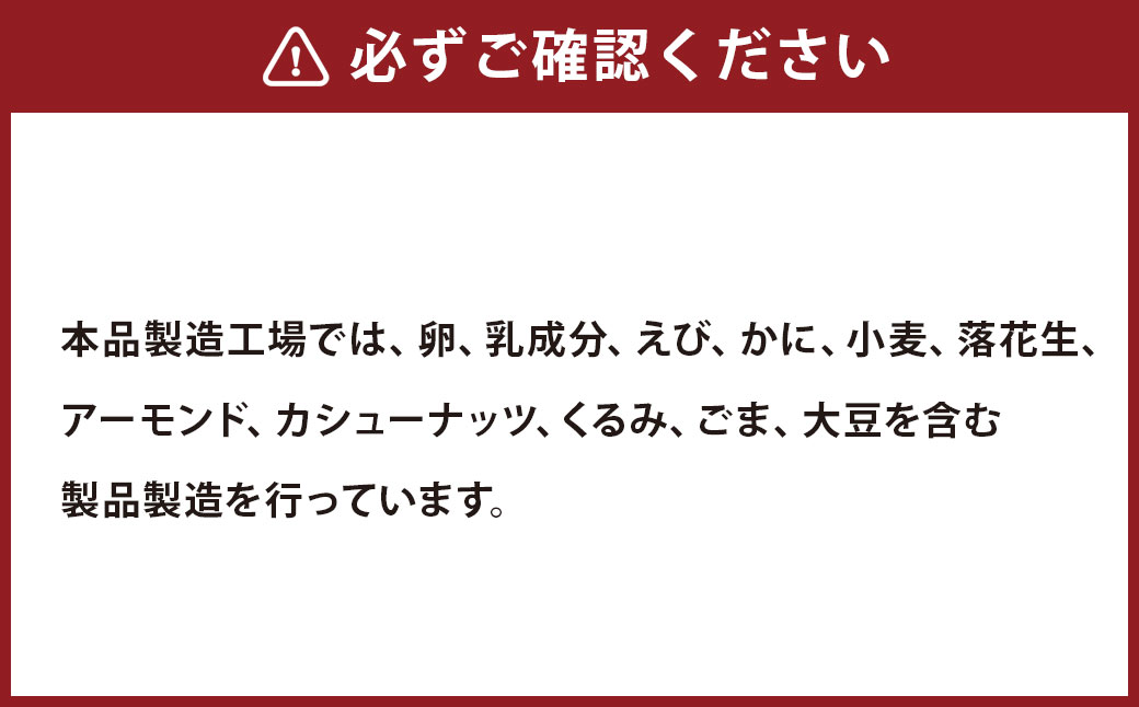 ※本品製造工場では、卵、乳成分、えび、かに、小麦、落花生、アーモンド、カシューナッツ、くるみ、ごま、大豆を含む製品製造を行っています。