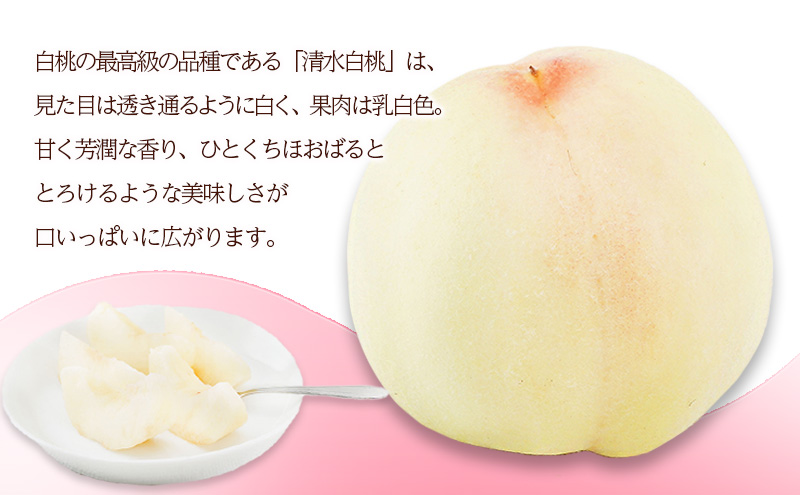 白桃の最高級の品種である「清水白桃」は、見た目は透き通るように白く、果肉は乳白色。甘く芳潤な香り、ひとくちほおばるととろけるような美味しさが口いっぱいに広がります。