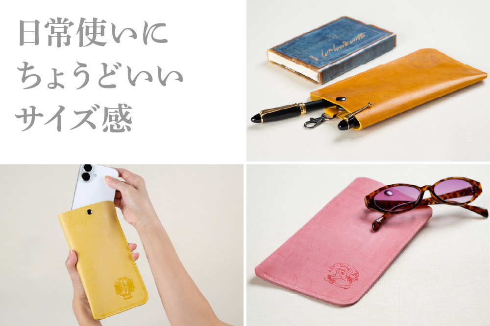 レザーケースは、しなやかで丈夫な牛革(本革)を使用しており、スマートフォンケースとしてはもちろん、鍵やイヤホン・筆記用具入れとしても活躍します。フック付きなので、バッグや鍵・ベルトループなどにも取り付けることができ、日常生活の中で気軽に使用いただけます。