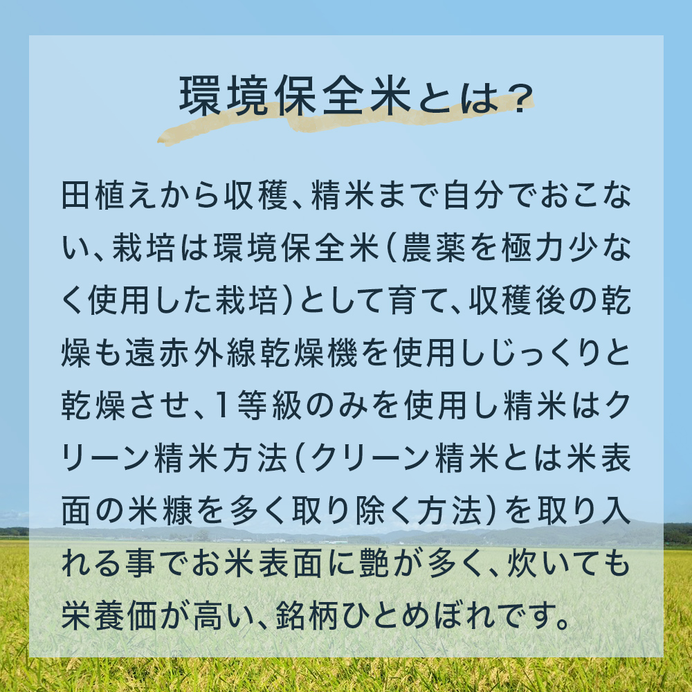 田植えから収穫、精米まで自分でおこない、栽培は環境保全米(農薬を極力少なく使用した栽培)として育て、収穫後の乾燥も遠赤外線乾燥機を使用しじっくりと乾燥させ、1等級のみを使用。