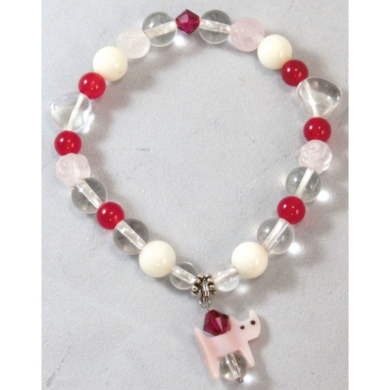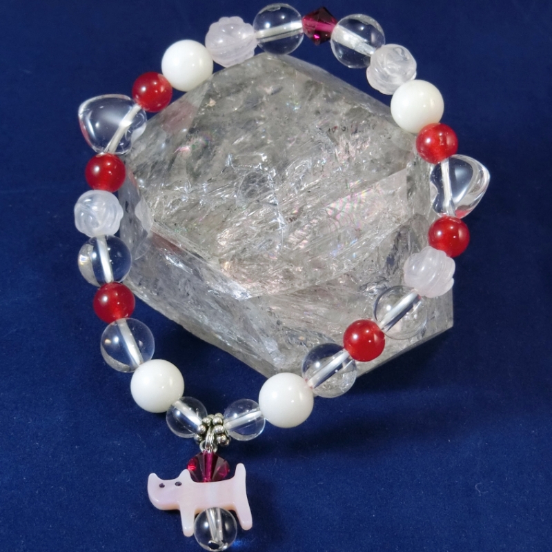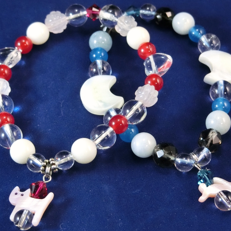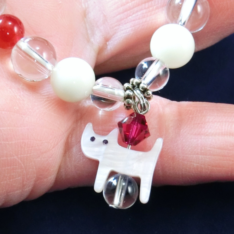 〈使用している石〉白珊瑚、ローズクォーツ、水晶、レッドめのう、猫はマザーオブパール
