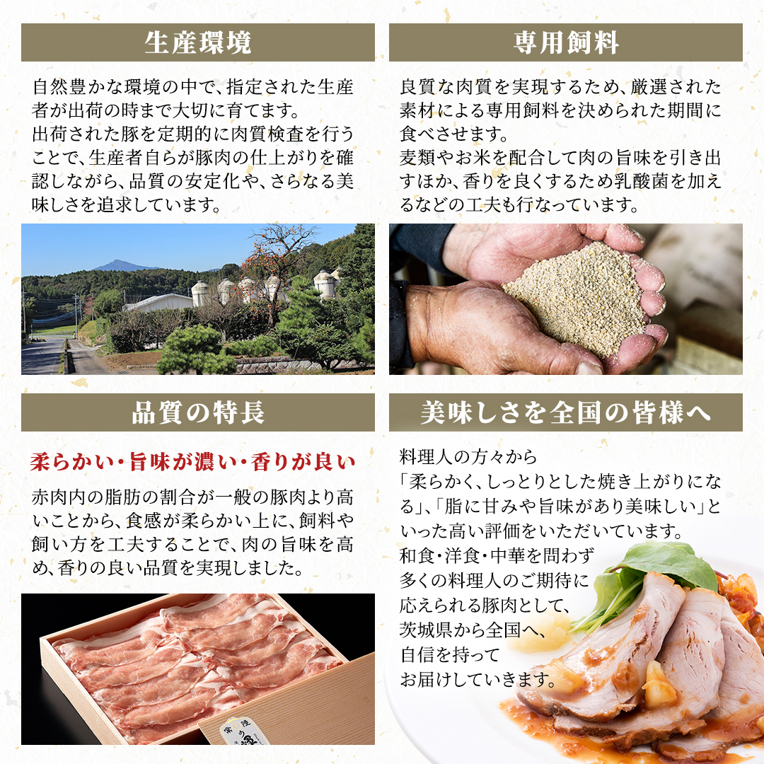 和食・洋食・中華を問わず多くの料理人のご期待に応えられる豚肉として、茨城県から全国へ、自信をもってお届けしていきます。