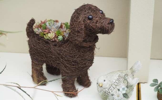 管理が簡単で手軽に楽しめる多肉植物を可愛いワンちゃんのバスケットに植え込みました。