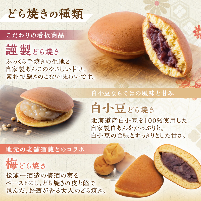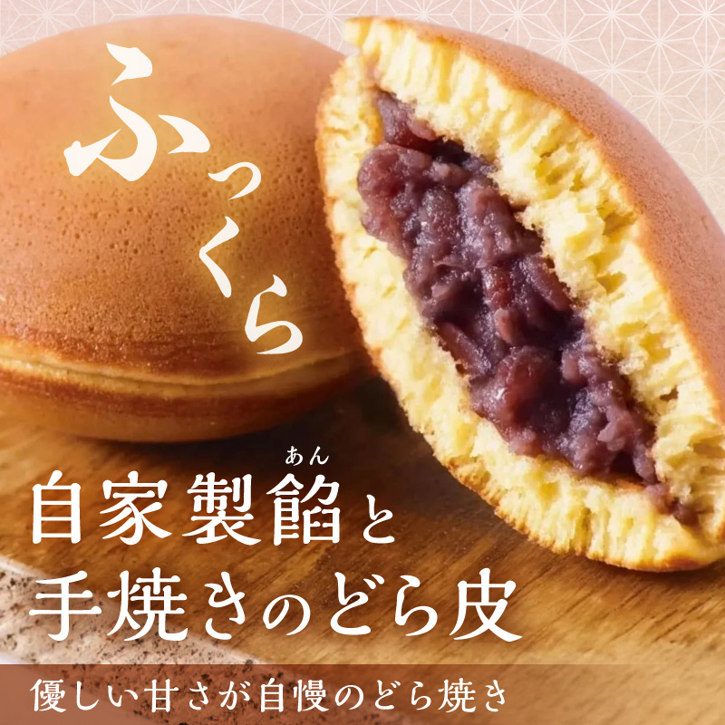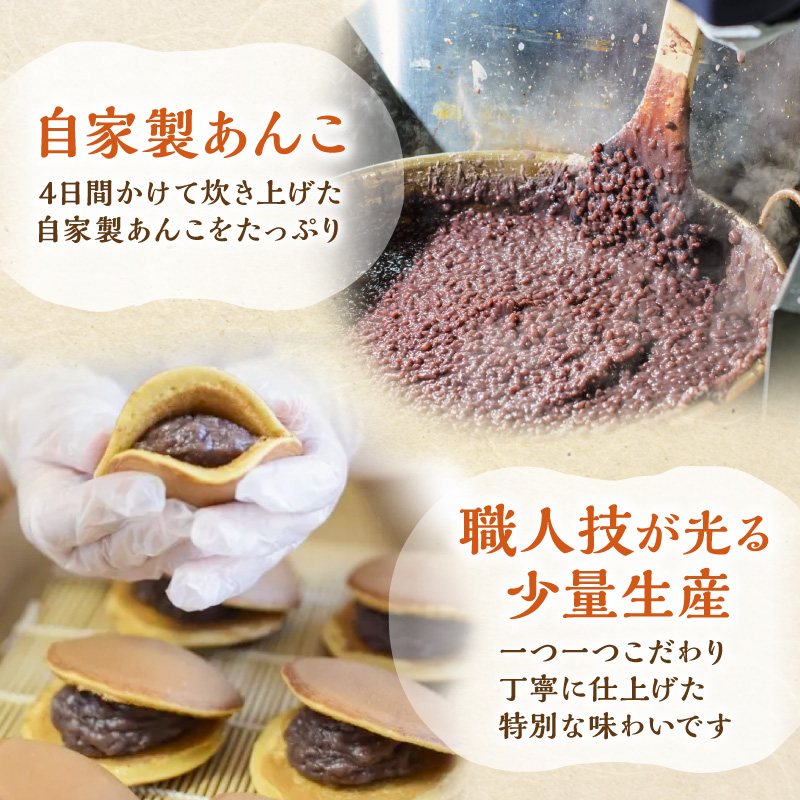 4日間かけてじっくり練り上げた自家製あんこと、1枚1枚丁寧に焼き上げたふんわりとした皮が自慢のどら焼き。