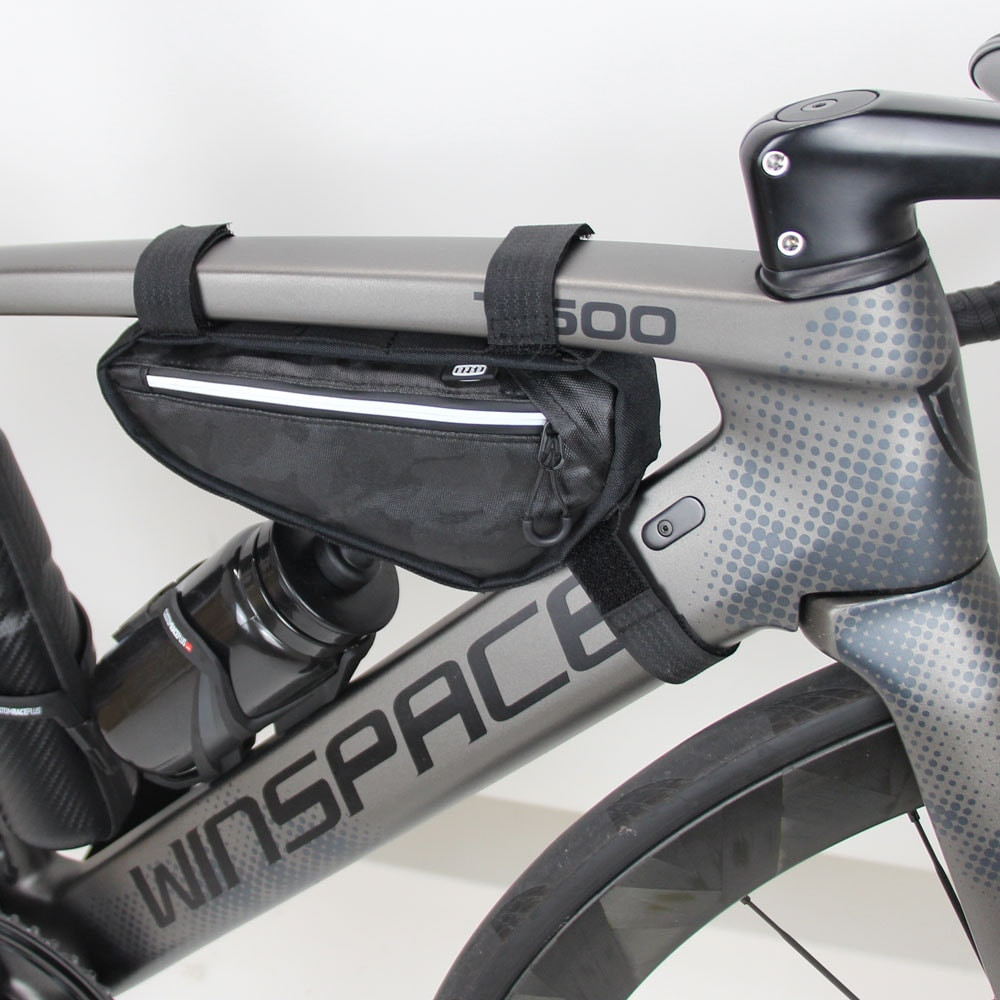 トップチューブバッグをさかさまにしたようなデザインで、スマホや携帯工具、財布やカメラ、予備バッテリーや補給食、自撮り棒やミニ三脚等を入れるのに便利です。