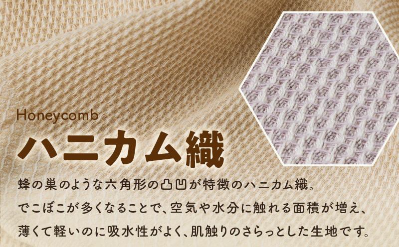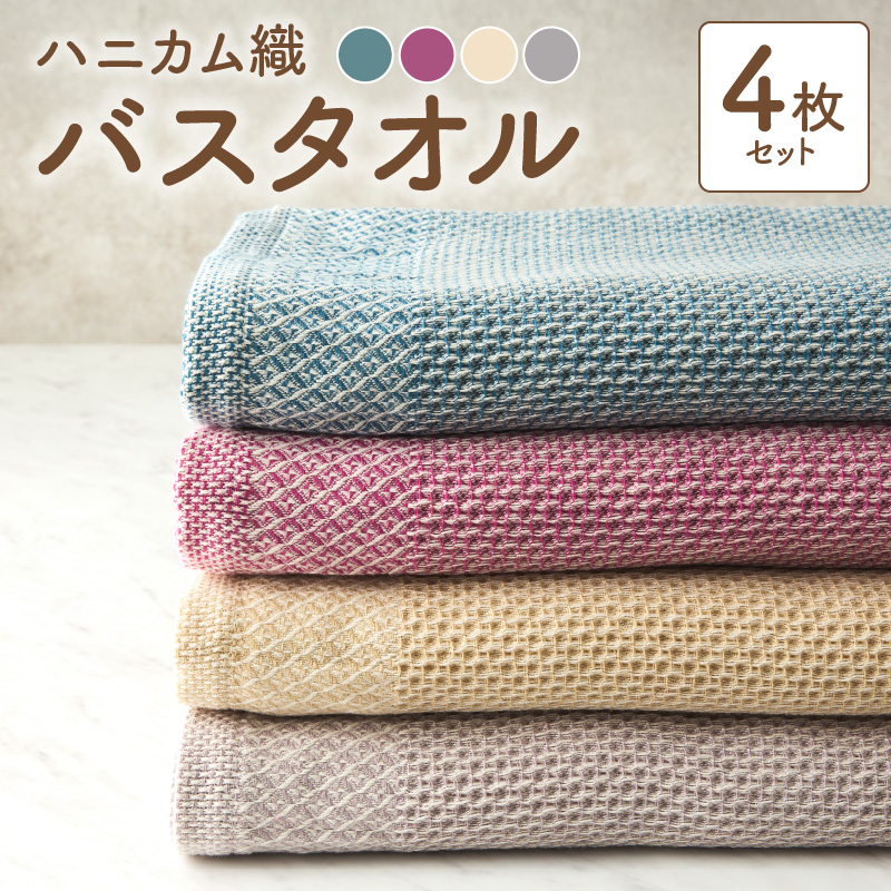 珍しいハニカム織は薄手ですが、吸水性・速乾性にとても優れているのが特徴。肌にあてるだけで水分を吸水し、ベタつかずサラッとした肌触りは驚き。また、天然素材のコットン100%を使用しており、肌に優しい素材です。毛羽立ちも少なく、薄手で丈夫なタオルのため、デイリー使いしていただけるバスタオル4枚のセットです。