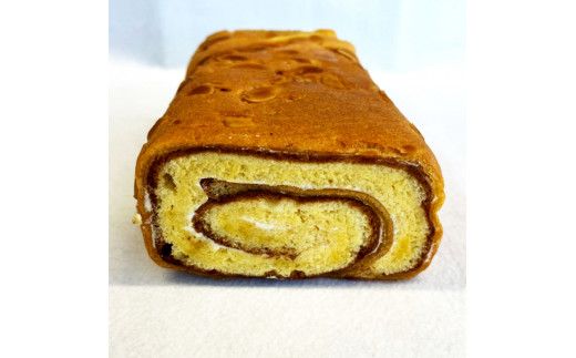 アーモンドを上に乗せたシュー皮の生地にスポンジを丁寧 に巻き上げて焼いたシンプルでずっしり感のある深く豊かな味わいです。
