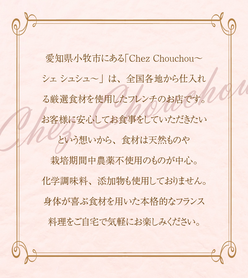 身体が喜ぶ食材を用いた本格的なフランス料理をご自宅で気軽にお楽しみください。
