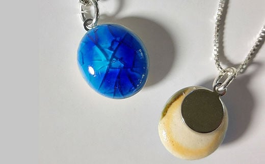 陶器の裏に金具貼り付け、Cカンでチェーンに通してあります。