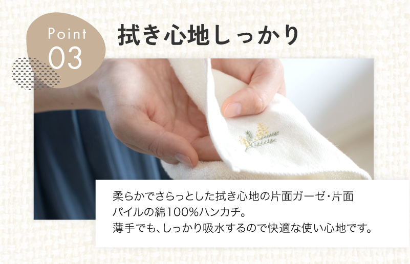 片面ガーゼ・片面パイルの綿100%素材、今治タオルブランド品質の吸水性を備えた上質なタオルハンカチ。