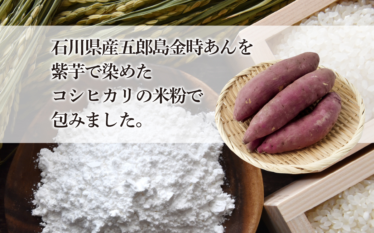 「金沢」のみやびの彩(あや)を「花あやめ」の掛詞(かけことば)にして、うすむらさきの生菓子に表してみました。石川県産五郎島金時あんを紫芋で染めたコシヒカリの米粉で包みました。