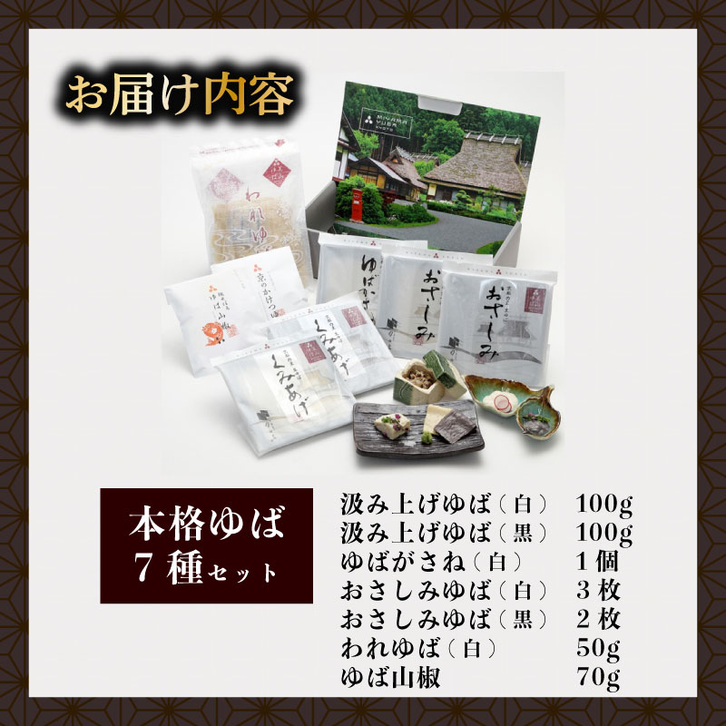 とろっとろの食感の汲み上げゆば、旨みが凝縮されたゆばがさね、絶妙な歯ごたえのおさしみゆば、人気のゆば山椒など7種をセットしました。