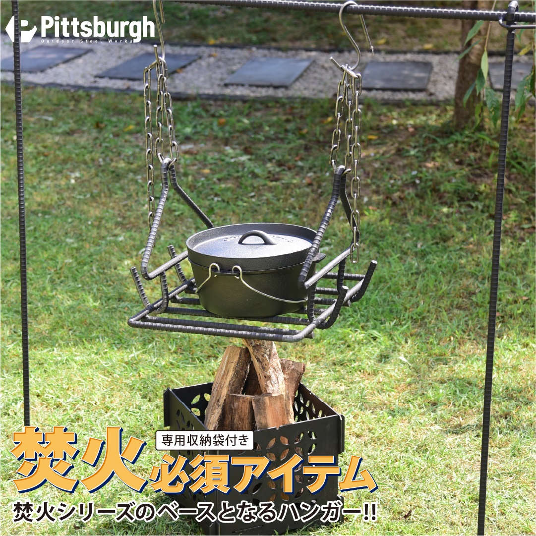 ポール:115cm×2本 バー:120cm×1本 重量:3.4kg 材質 :鉄 カラー:耐熱ブラック ※使用により塗装が劣化した場合は市販の耐熱ブラックで塗装してください。 その他:ポールをハンマーで地面に十分に打ち込んで使用してください。 ※写真の焚火台「ファイヤーピット(和柄七宝)」及び「焚火用 トライアングルハンガー(グリルセット)」「ダッチオーブン」などは付属していません。