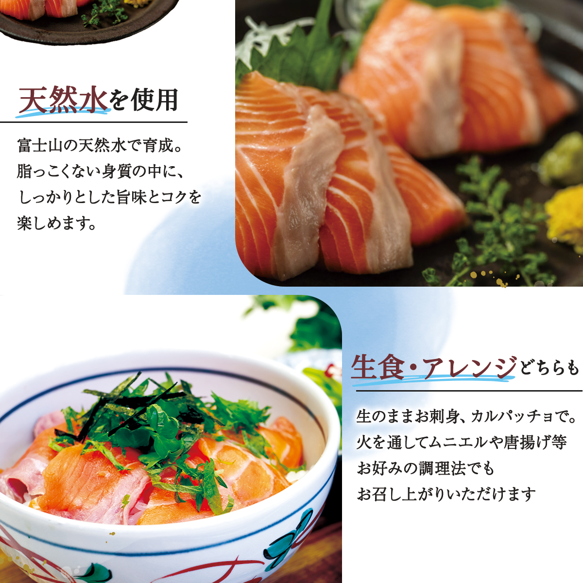 循環式陸上養殖場「富士・桂川ファクトリー」で、水質が良い富士山の伏流水を使用し養殖しています。最先端のICT技術を活用し、資源の節約や品質確保を実現しました。また、綺麗な地下水で屋内養殖することで、ワクチンや投薬等をすることなく寄生虫や病原菌の心配のない、安心安全で美味しいサーモンを提供することができるようになりました。
