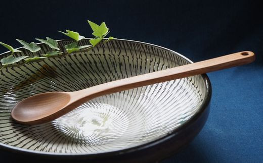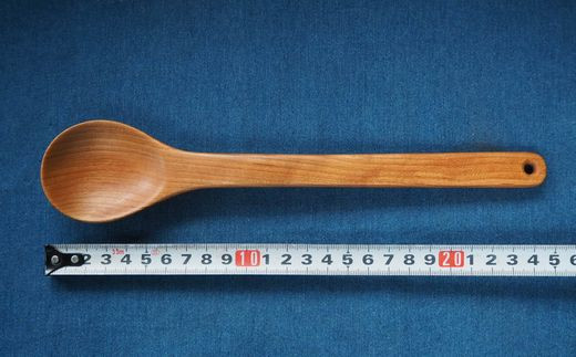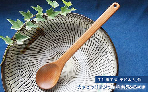 実物は、樹齢100年以上の山桜ならではの杢目と色艶で素材の魅力を感じていただける作品です。この調味料の計量ができて、料理を炒めて、掬える木べラは、丁寧な手仕事でしか作ることのできないハンドメイド作品です。