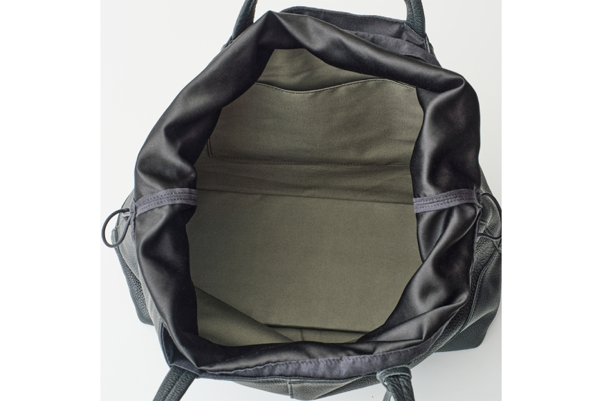 スエード調の巾着を中に落とせばオープントートとしてもお使いいただくことができ、底板と大きなマチでたっぷり収納でき、底板をとればスマートにマチをたためます。