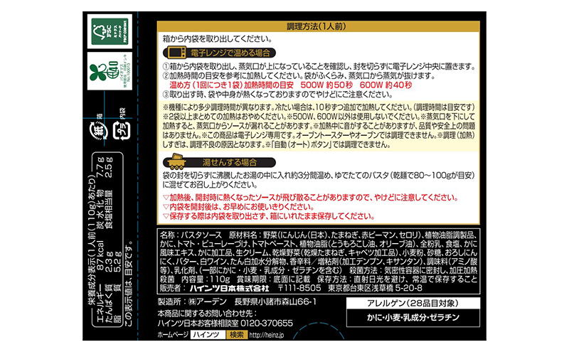 「ハインツ」大人向けのパスタ 紅ずわい蟹のトマトクリーム 110g×10箱