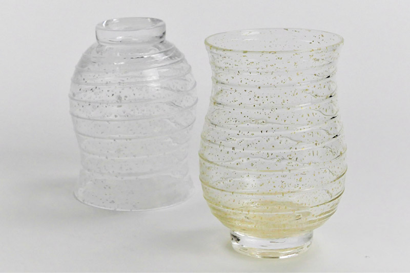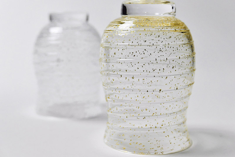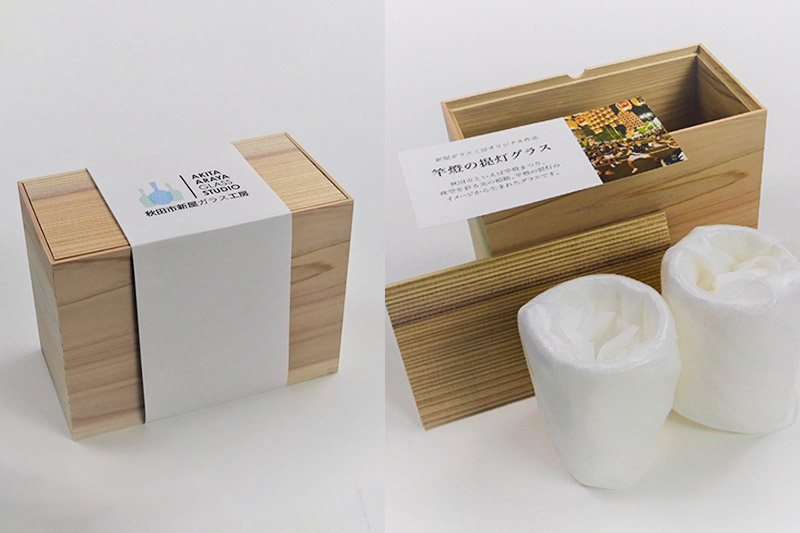 金銀をあしらったグラスはすべて手作り。薫り高い秋田杉の箱に入れてお届けします。