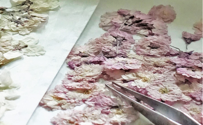 作家がつんで、押し花にした数種類の桜をあしらいました。