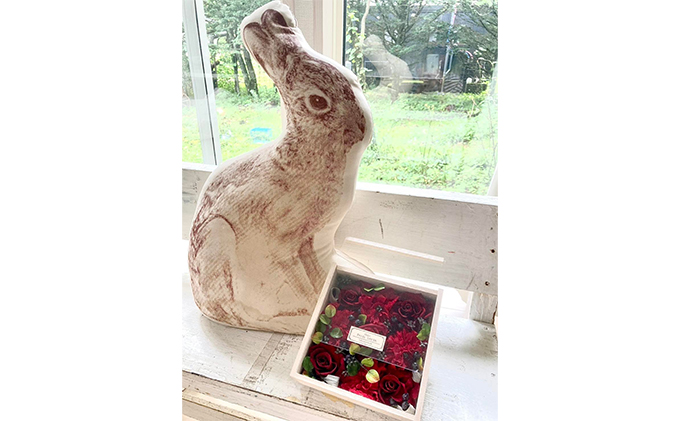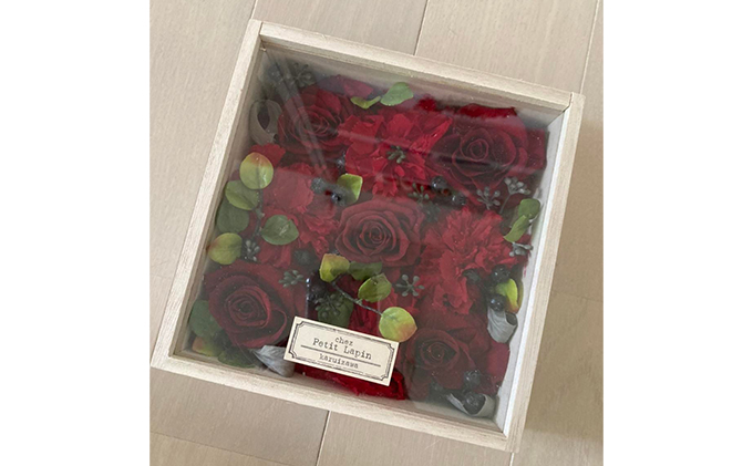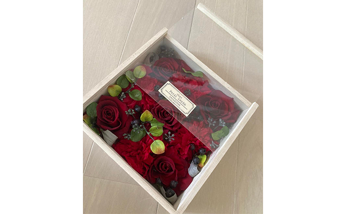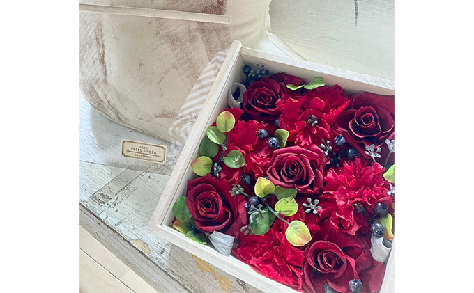 プリザーブドフラワーを木製のボックスに入れたアレンジメント。(プリザーブドフラワーはエクアドルやフランス産、木箱は中国製を軽井沢にてアレンジ致します)