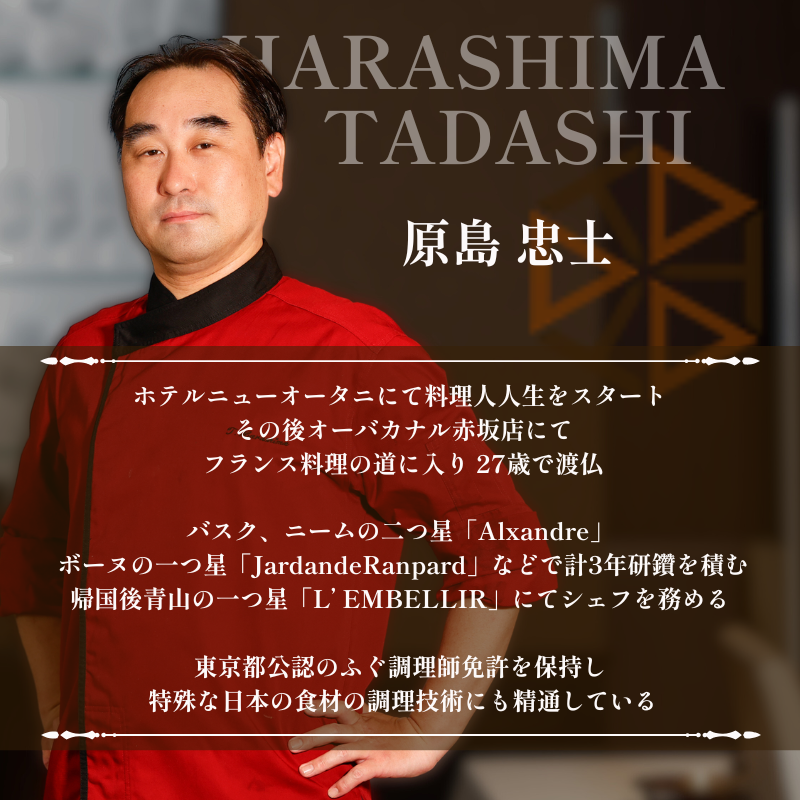 18歳からホテルニューオータニで修業を始め、【オーバカナル赤坂】で本格的にフレンチの道へ。27歳で渡仏し、星付きの名店を巡って約3年間経験を積む。帰国後、南青山の【L'EMBELLIR】で腕を磨き、東京都のフグ調理師免許を取得。2016年2月、麻布十番に【ALLIÉ】をオープン。2025年に都立大学に移転。