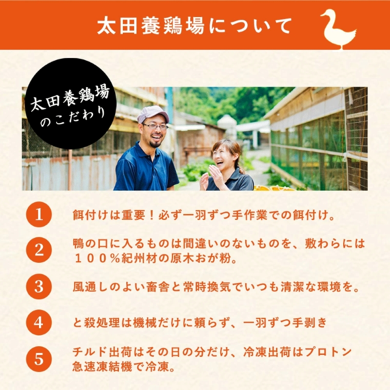 紀州鴨は温暖で一年を通して気温の変化の少ない和歌山県有田郡で飼育されています。 ストレスのない環境で10羽/坪以下の低密度飼育をしています。 風通しの良い畜舎で一年中浜風を受け、山から流れてくる谷水を飲み、 独自配合のペレット飼料を食べ、紀州材100%のおが粉の敷料の上で育った鴨は、 真っ白い脂と鮮やかな赤みの肉のコントラストが美しい外観を持ち、鴨肉独特の臭みが少ない、 しかしながら濃厚な脂のコクがある最高級の紀州鴨になります。