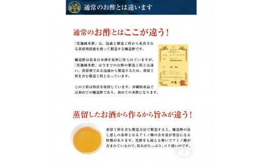 泡盛の製造工程から産出された蒸留残留液には、豊富なアミノ酸が含まれています。これを泡盛に差し戻して酢酸と発酵させることで、アミノ酸はさらに増幅します。この製法は、2016年3月に『泡盛を使用したアミノ酸高含有純米酢の製法』として特許を取得。