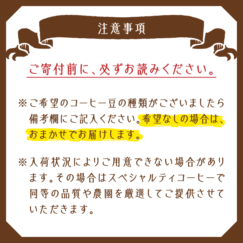 ※ご希望のコーヒー豆の種類がございましたら備考欄にご記入ください。希望なしの場合は、おまかせの1種類をお届けします。