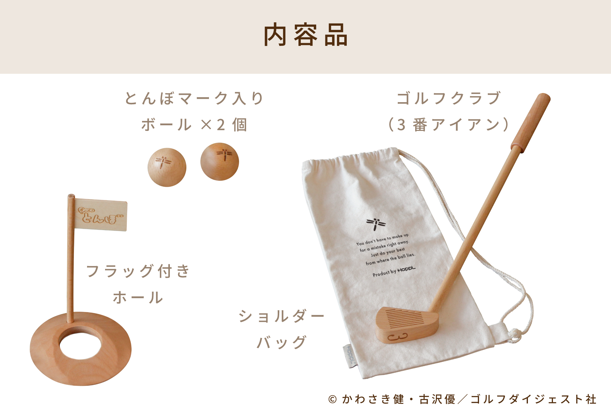 主人公・とんぼの使用する3番アイアンを再現したゴルフクラブ、とんぼマーク入りのボール、フラッグ付きホールがセットになっており、専用のショルダーバックに入れて持ち運ぶことができます。