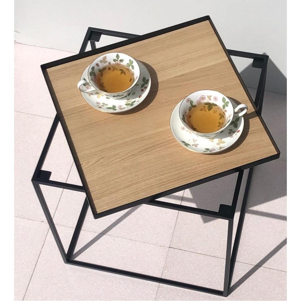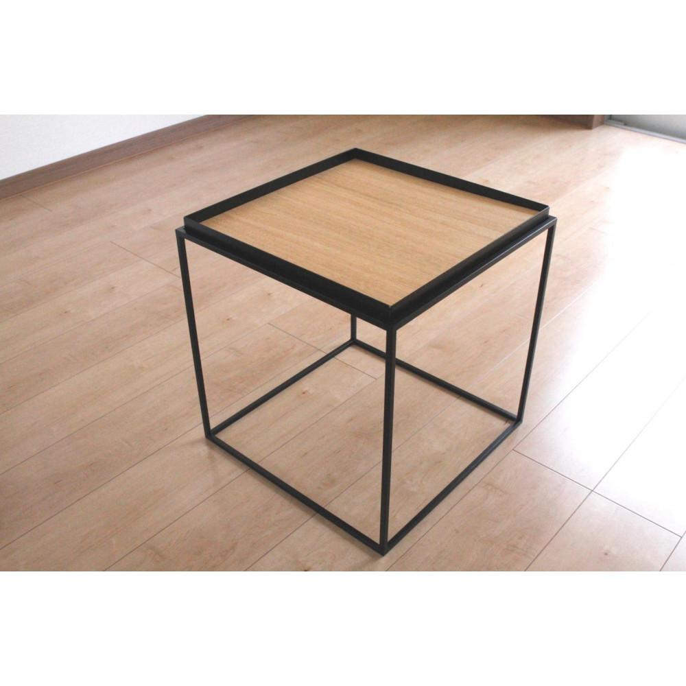 天板のトレイを取り外す事ができるテーブルです。サイズは幅40,奥行40、高さ41.2cm。ベッドやソファサイドにちょうどよい大きさです。天板はナラ突板貼りです。