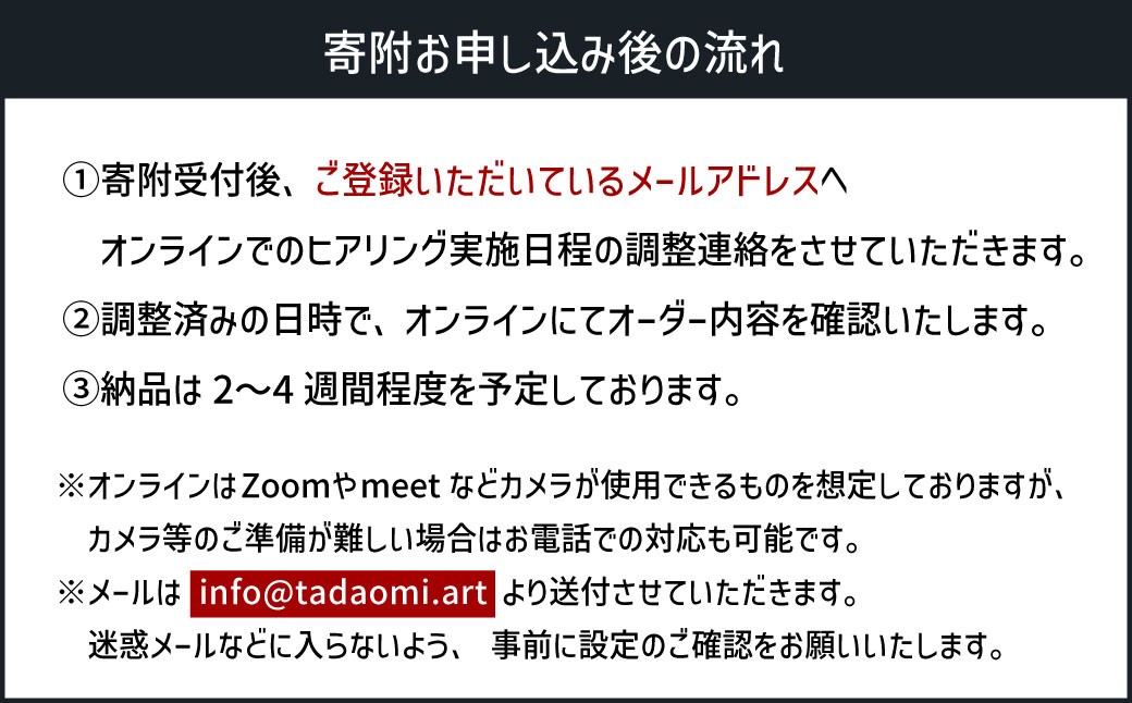 ※メールはinfo@tadaomi.artより送付させていただきます。迷惑メールなどに入らないよう、事前に設定のご確認をお願いいたします。