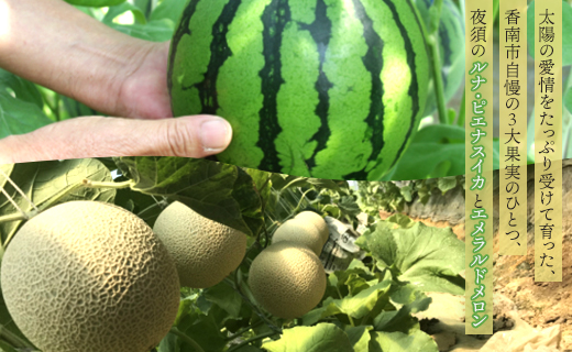 太陽の愛情をたっぷり受けて育った、香南市自慢の3大果実のひとつ、夜須の「ルナ・ピエナスイカ」と「エメラルドメロン」。