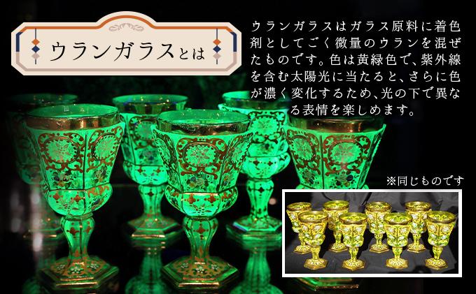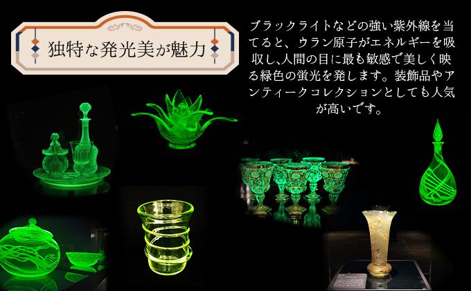 ウランガラスは、ガラス原料に着色剤としてごく微量のウランを混ぜて作られるガラスで、美しい黄緑色が特徴です。