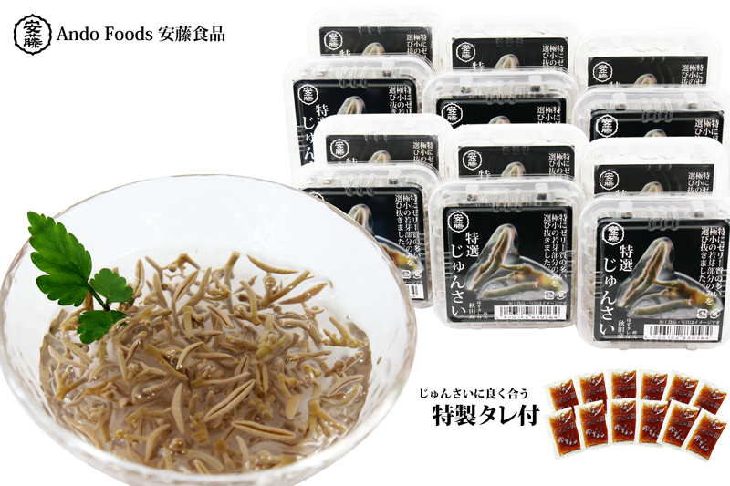 今まさに大きくなろうとしているじゅんさいの極小の若芽部分はたっぷりのゼリー質に覆われていて柔らかく抜群の食感です。この極小の若芽部分のみを選び抜いたものが特撰品です。一つ一つカット・選別し、極小の若芽の部分だけを選び抜く作業は大変な手間がかかりますが、その一手間一手間が抜群の食感を生み出します。