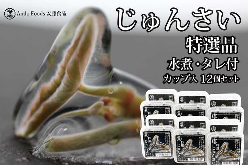 小舟に乗り一粒一粒手摘みしたじゅんさいを更にカット・選別し、特にゼリー質の多い極小の若芽部分のみを選び抜いた特撰品、水煮・カップ入り・タレ付きです。