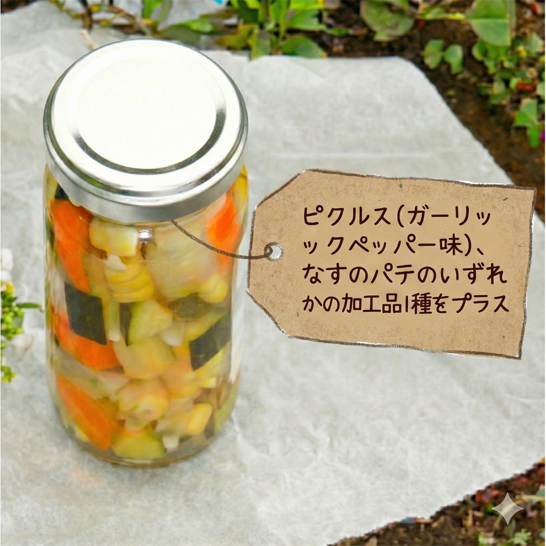 ・ピクルス(ガーリックペッパー味)または、なすのパテのいずれかの加工品をプラスします。