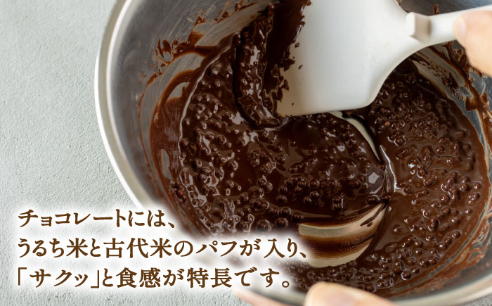 チョコレートには、うるち米と古代米のパフが入り、「サクッ」と食感が特長です。