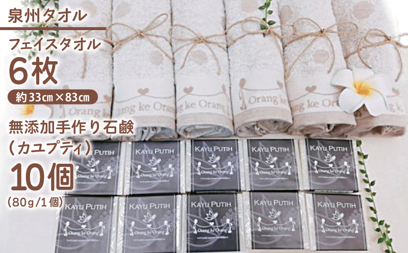 泉佐野産の泉州タオルと泉佐野市の無添加石けん専門店の石けんのセットです。生協商品開発担当の経験を活かして開発したこだわりの無添加石けんです。合成保存料・合成着色料・合成香料など一切使用せず、ココナッツオイルを主原料に手作りしました。赤ちゃんと一緒に家族でお使いいただく方も多く、毎日のバスタイムに安心して取り入れていただけます。
