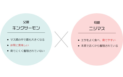 マス類で高級とされるキングサーモンと山梨県で生産量ナンバーワンのニジマスを交配し開発されました。