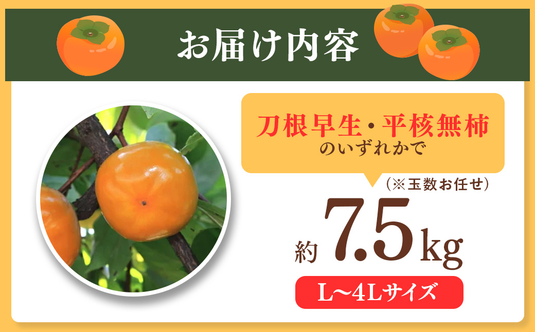 約7.5kg/玉数:24玉(4L)、28玉(3L)、32玉(2L)、36玉(L)のいずれか(玉数おまかせ)/品種:刀根早生・平核無柿のいずれか/等級:青秀以上