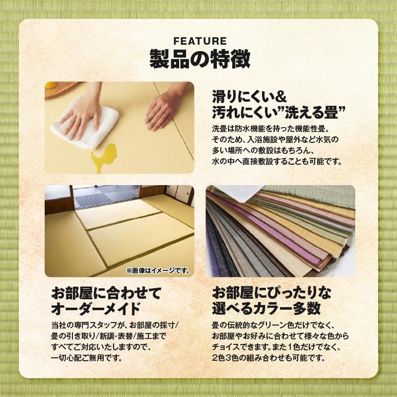 洗える畳『洗畳』の特徴は、汚れに強く塩素系漂白剤や中性洗剤でお手入れをする事が可能です。