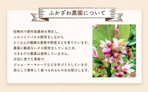●ふかざわ農園について 枕崎市で耕作放棄地を再生し、ニホンミツバチの飼育をしながら たくさんの種類の果物や野菜などを育てています。 農薬に敏感なハチの飼育をしているため、出来るだけ農薬は使用しない栽培をしております。 大切に育てた果物でジャム・マーマレードなども手作りしています。 安心して美味しく食べられるものをお届けしています。