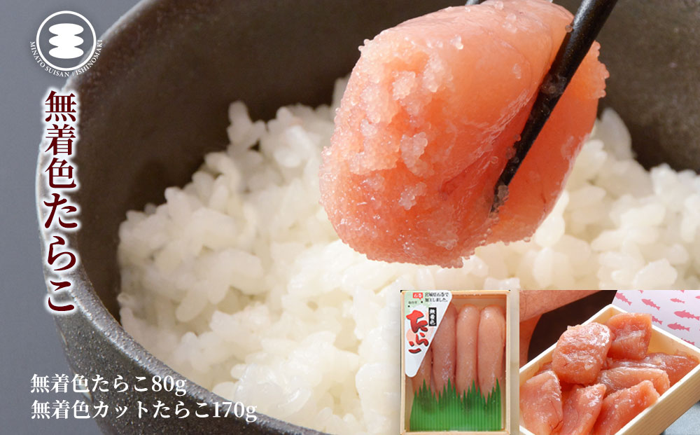 ・無着色たらこ80g ・無着色カットたらこ170g 【原材料】 すけとうだらの卵(ロシアまたはアメリカ)、食塩/調味料(アミノ酸等)、甘味料(ステビア)、酸化防止剤(V.C)、発色剤(亜硝酸Na)
