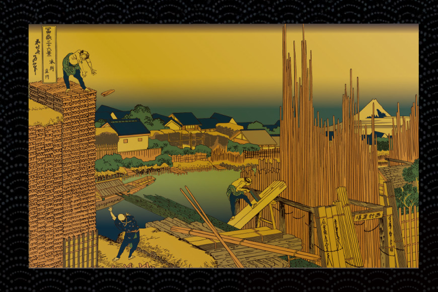 本所立川:材木を運ぶ職人たちの働く姿と遠景の富士山を対比させ、江戸の生活感と自然の雄大さを表現した図でございます。