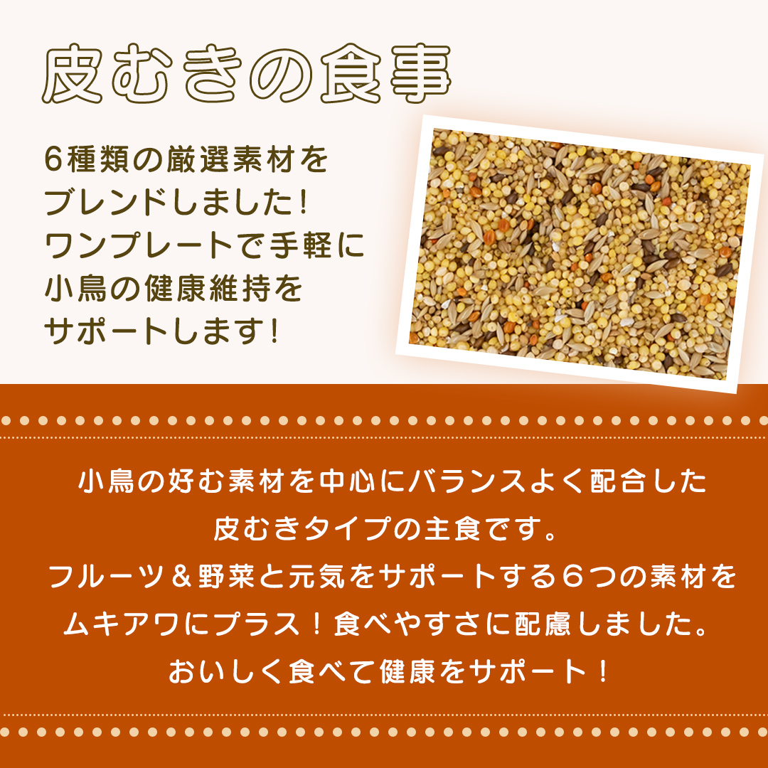 小鳥の好む素材を中心にバランスよく配合した皮むきタイプの主食です。