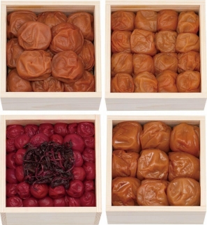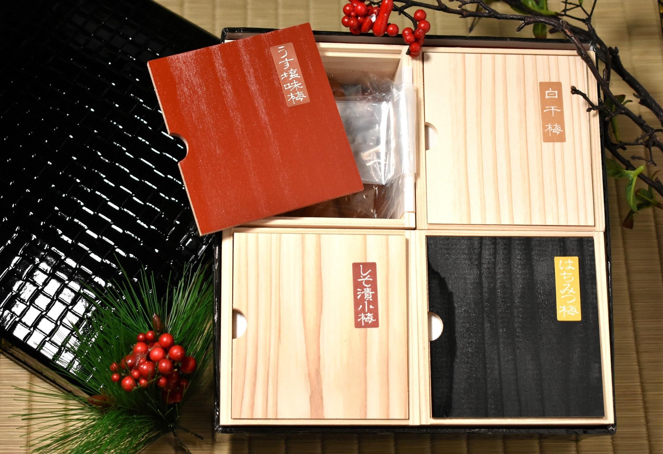 紀州塗箱に入る梅干は、うす塩・はちみつ梅・白干梅・しそ漬梅の4種類の味を食べ比べていただける詰め合わせセットです。艶やかで粒ぞろいの梅干が、紀州塗を施した雅な木箱に入り、目でも楽しんでいただけます。それぞれの味の違いをどうぞお楽しみください。
