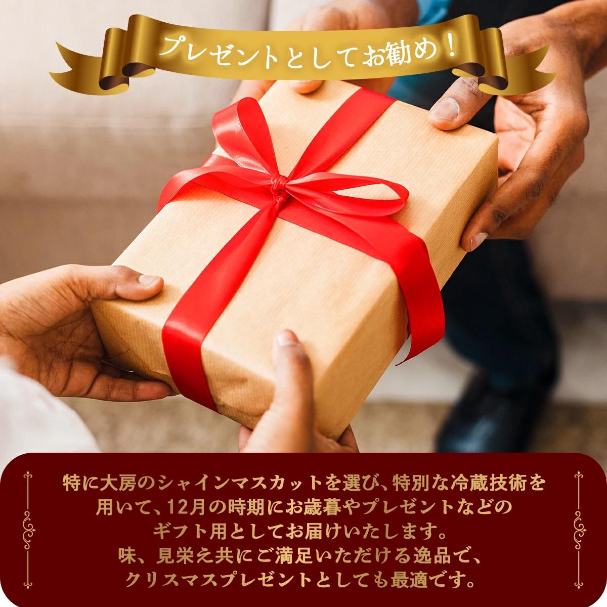 特に大房のシャインマスカットを選び、特別な冷蔵技術を用いて、12月のギフトシーズンにお届けしています。ギフトボックスにお入れしてお届けしますのでプレゼントにもぴったりです。味、見栄え共にご満足いただける逸品です。