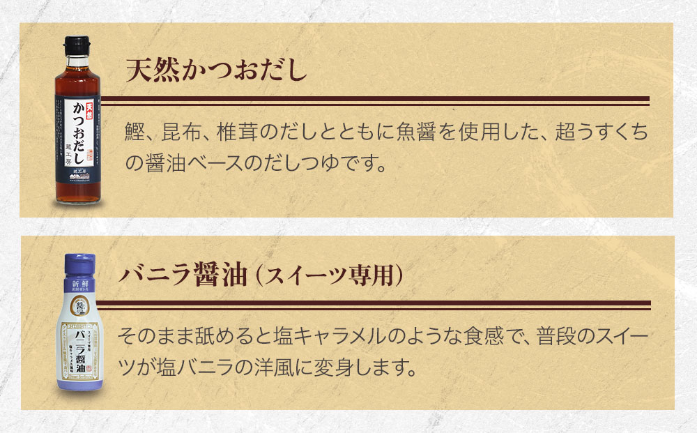 ●バニラ醤油(スイーツ専用):糖類(砂糖、砂糖混合ぶどう糖果糖液糖、水飴)、醤油、みりん/加工澱粉、香料