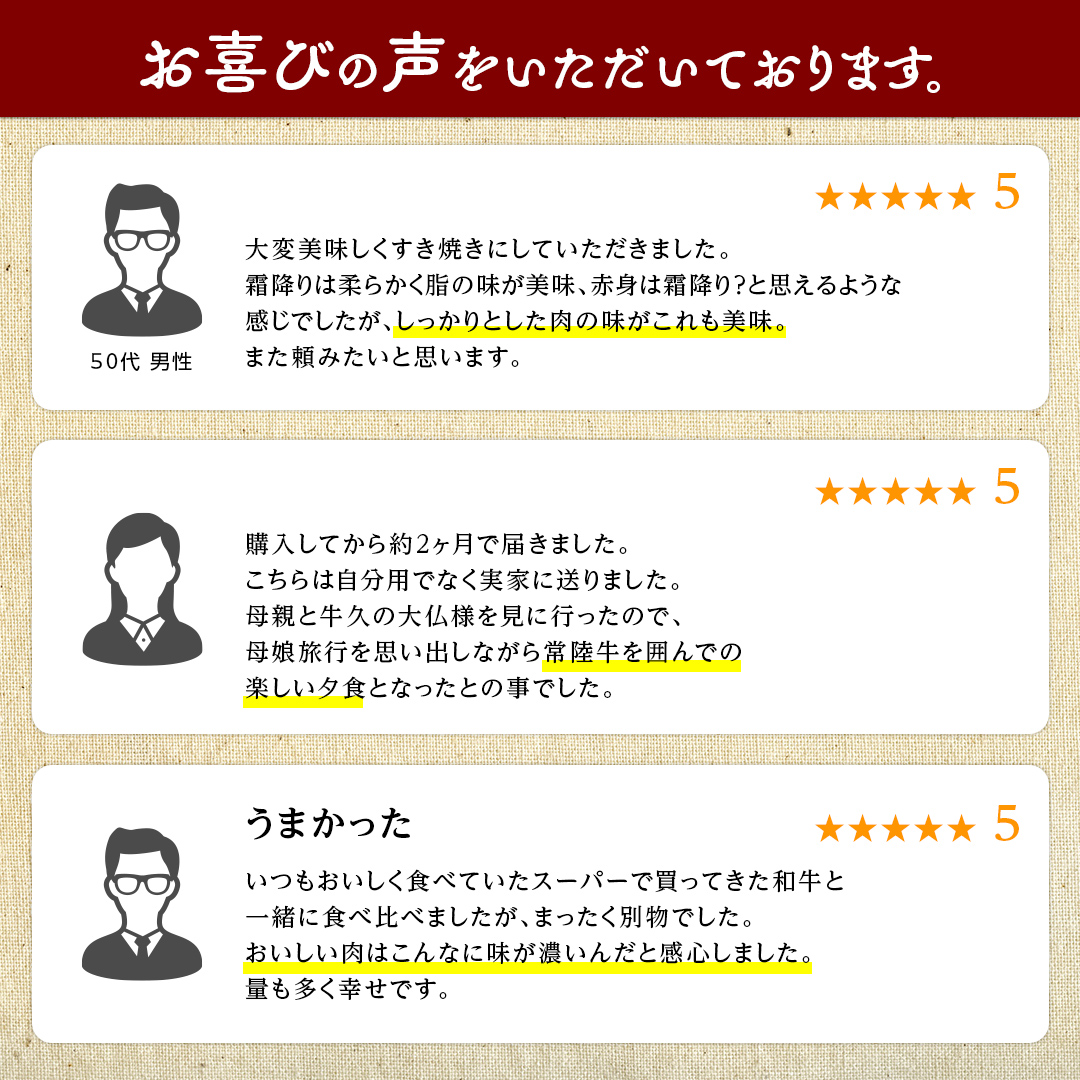 常陸牛はきれいな霜降りと良質な赤身が特徴です。肉質が柔らかく、風味と甘みがあり旨味が強いです。3ヶ月連続のお届けなので、1ヶ月目は食べ比べ、2ヶ月目・3ヶ月目は・・・料理方法は多数!!是非、美味しい常陸牛をご堪能ください。