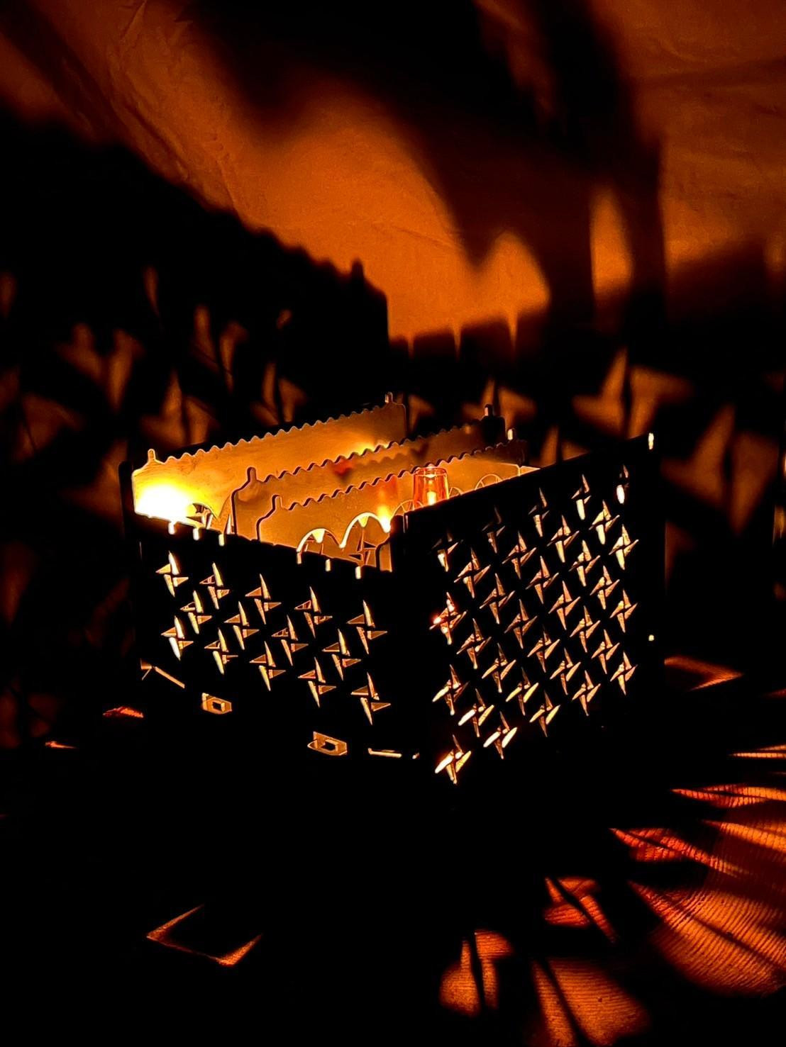 焚火、焚火調理、間接照明の3WAYで使用可能な3WAY焚火BOX。A4サイズ収納可能。